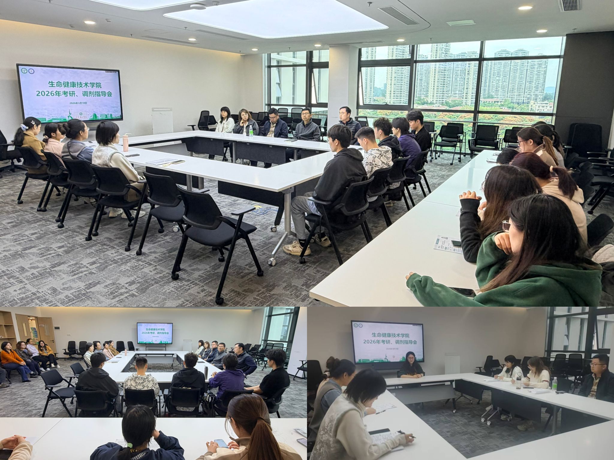 在国际合作创新区3C501会议室举行2026年考研复试指导会。性爱视频党委副书记葛金虎、营养与健康系主任刘宇佳、教师代表及辅导员参加会议,与性爱视频2026届考研上线毕业生共话升学策略。